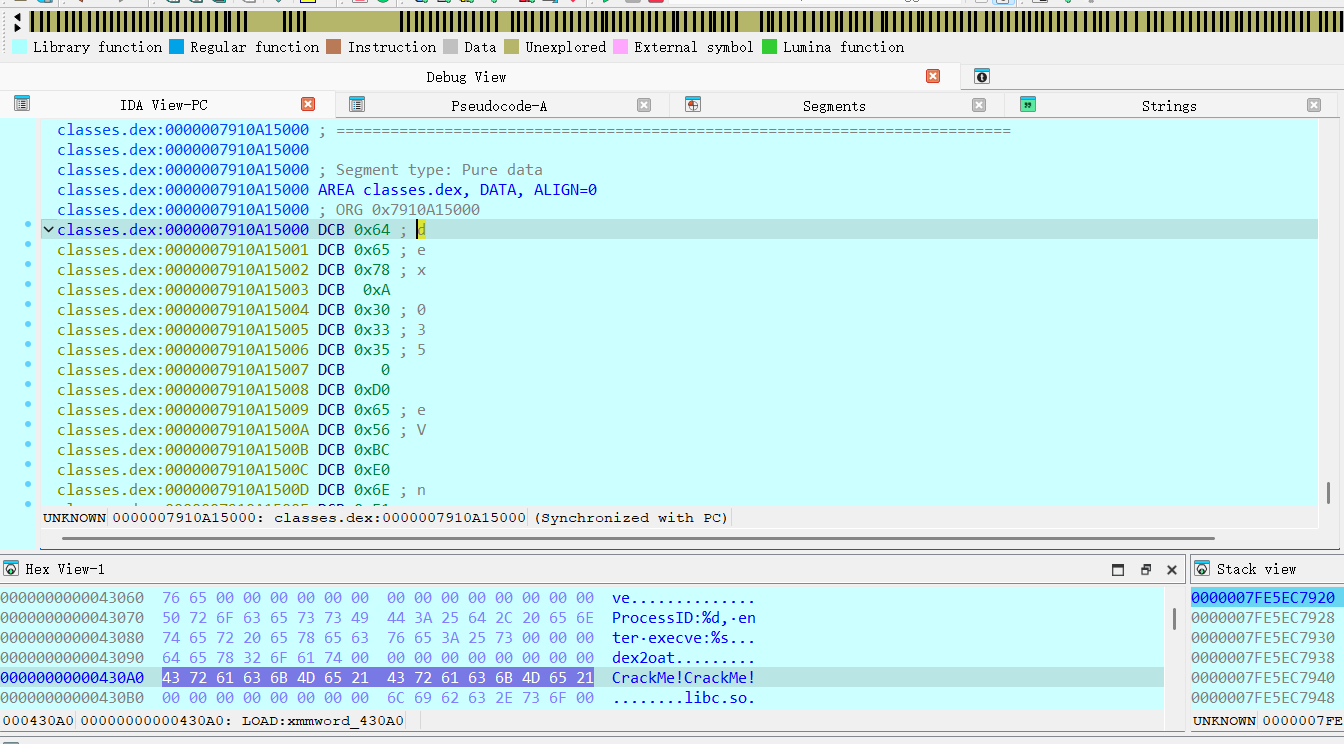 这里就是一个hook操作if ( *(a2 + 16) == 940 )这里是比较dex文件的长度,我们用frida hook出的dex文件长度就是940,这里将0x178位置的字节hook为unk_42D90的数据,将0x217出的字节替换为xmmword_430A0也就是CrackMe!CrackMe!