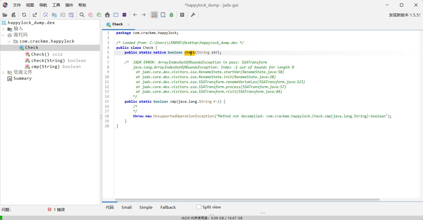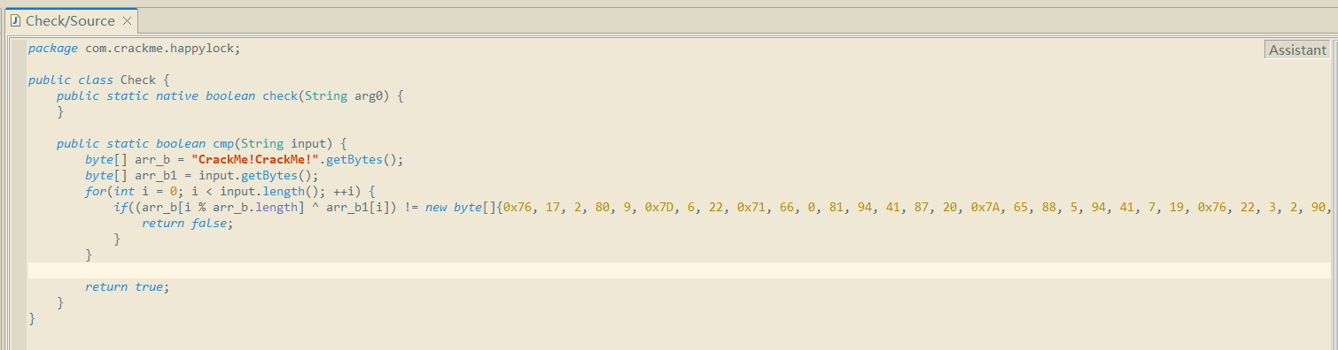 就是一开始hook解密字符串的com.crackme.happylock.Check类,尝试在jadx/jeb中搜索,无法直接找到,如果说在assets并且未加密的话,jeb或者jadx也是同样可以识别到这个类的,这里并没有识别到,那么就有热加载dex操作(在 App 运行过程中不重启、不重装,动态加载一个新的 dex 文件到内存里,并让虚拟机执行其中的代码)