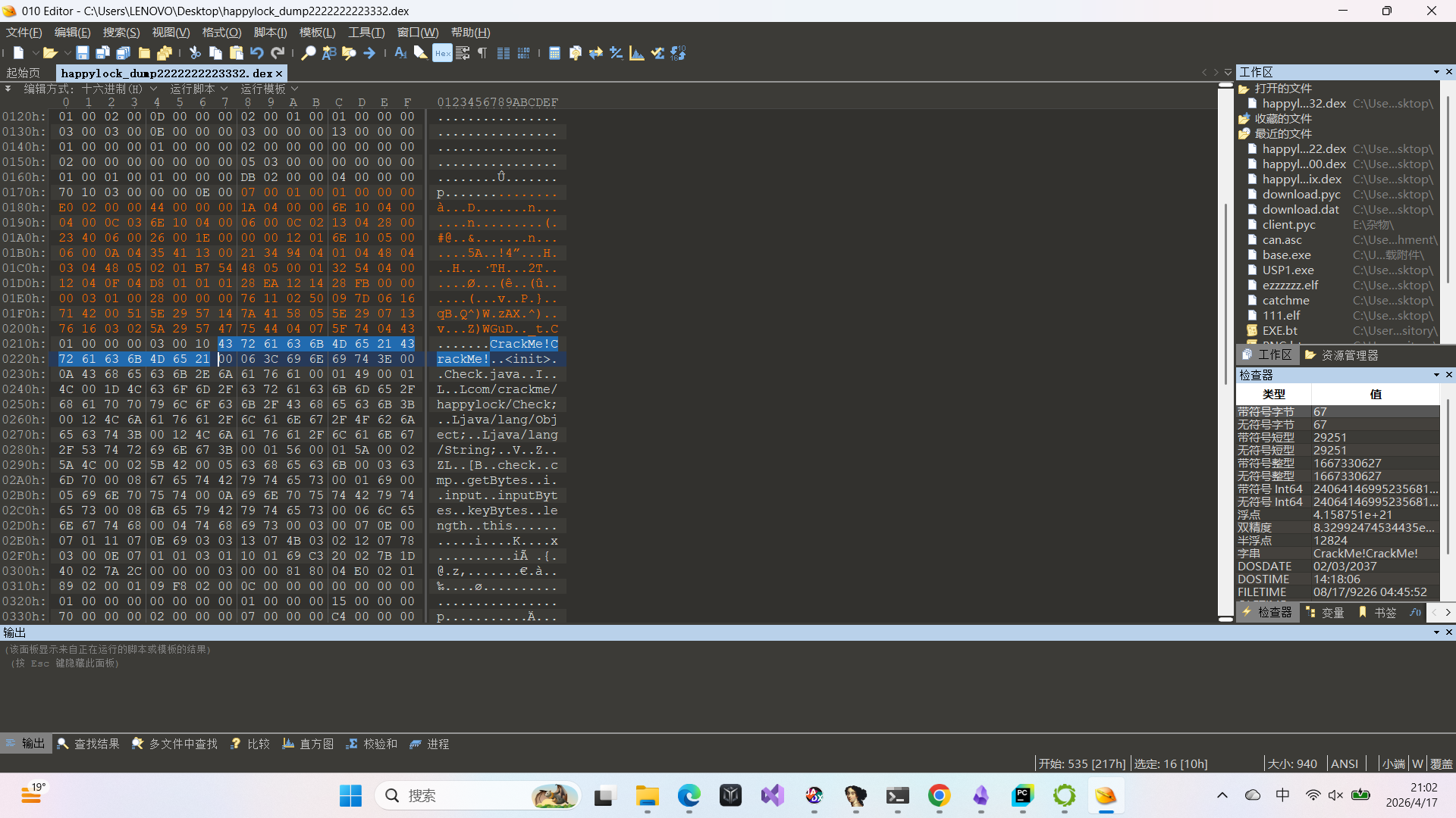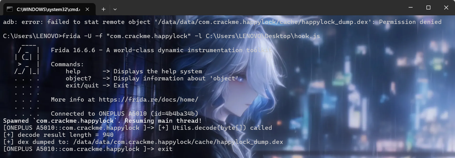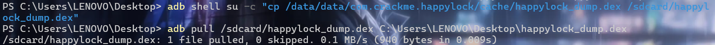 | adb shell su -c "cp /data/data/com.crackme.happylock/cache/happylock_dump.dex /sdcard/happylock_dump.dex" adb pull /sdcard/happylock_dump.dex C:\Users\LENOVO\Desktop\happylock_dump.dex
