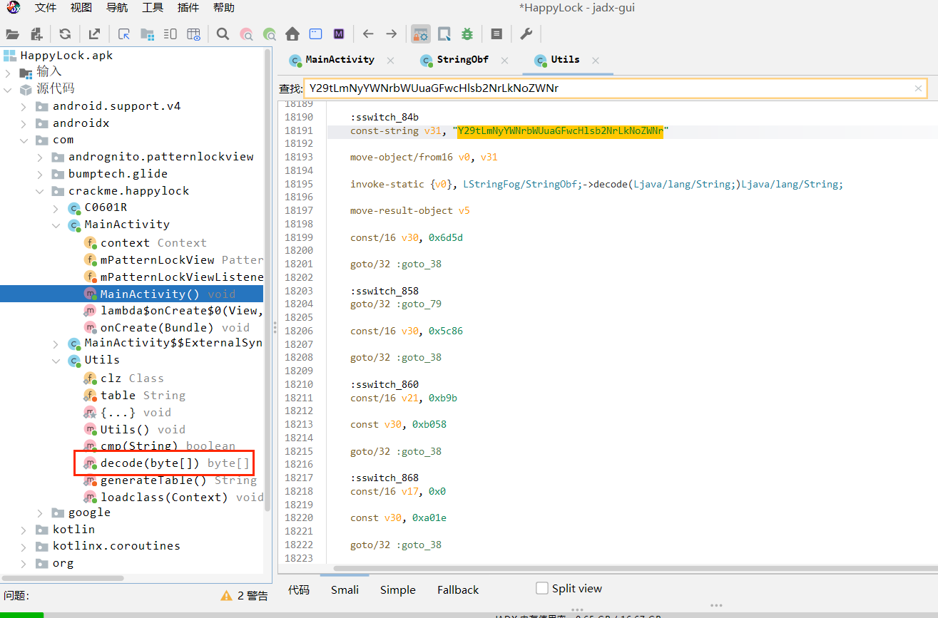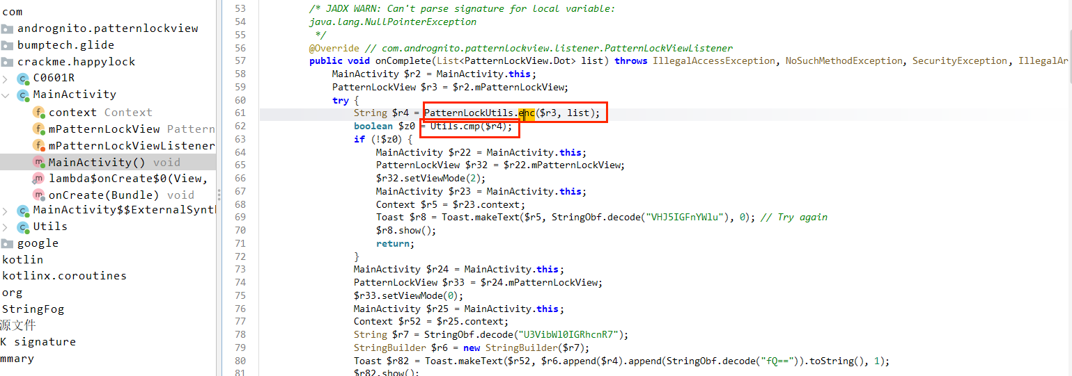运行app是一个手势锁,用jadx/jeb打开文件后可以看到字符串被加密了,有控制流平坦化