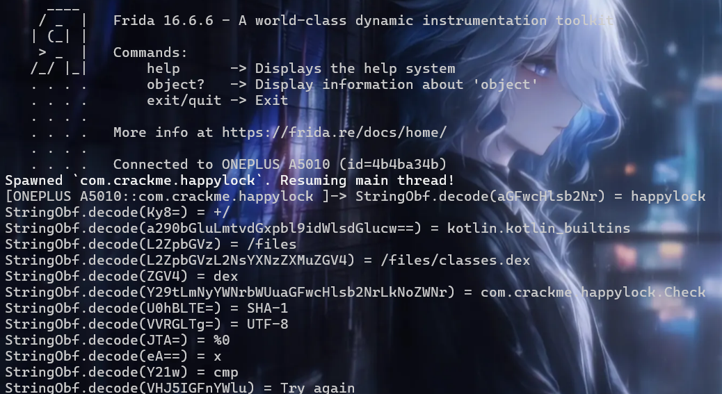 | Java.perform(function () { let a = Java.use("com.crackme.happylock.Utils"); let FileOutputStream = Java.use("java.io.FileOutputStream"); let dumped = false; a.decode.overload("[B").implementation = function(data){ console.log("[+] Utils.decode(byte[]) called"); let result = this.decode(data); console.log("[+] decode result length = " + result.length); if(!dumped){ dumped = true; let path = "/data/data/com.crackme.happylock/cache/happylock_dump.dex"; try{ let fos = FileOutputStream.$new(path); fos.write(result); fos.close(); console.log("[+] dex dumped to: " + path); }catch(e){ console.log("[-] dump failed: " + e); } } return result; } });